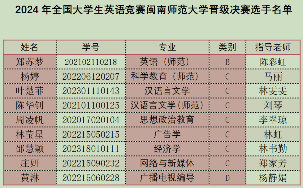 本次竞赛初赛成绩于初赛结束后两周内公布,参赛学生可以登录官网查询。根据初赛成绩和名次评选出进入决赛的选手以及本届大赛二等奖和三等奖获奖者。以下为全国大学生英语竞赛闽南师范大学晋级决赛选手名单。