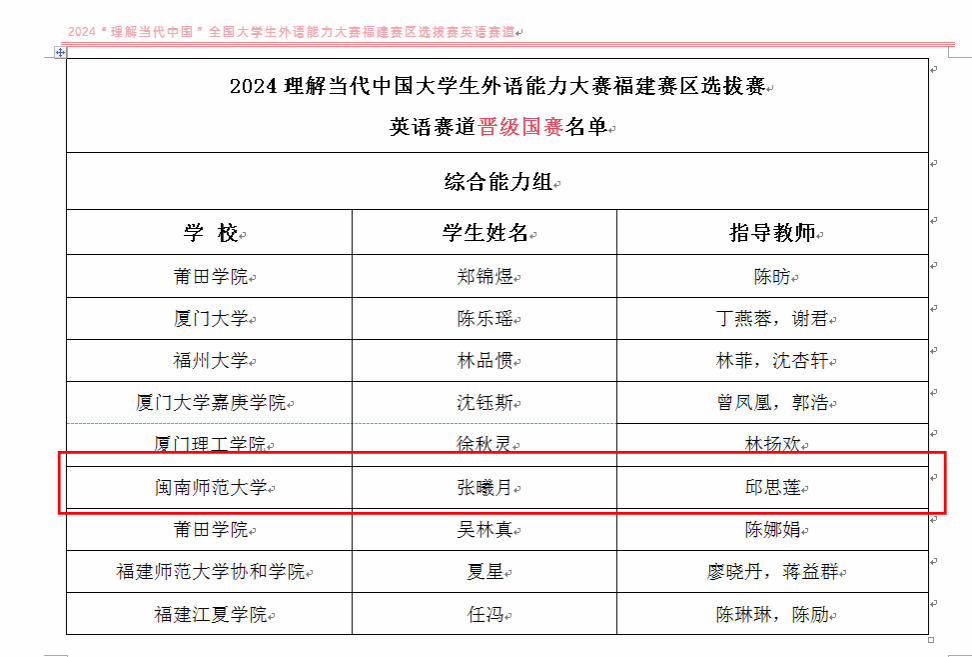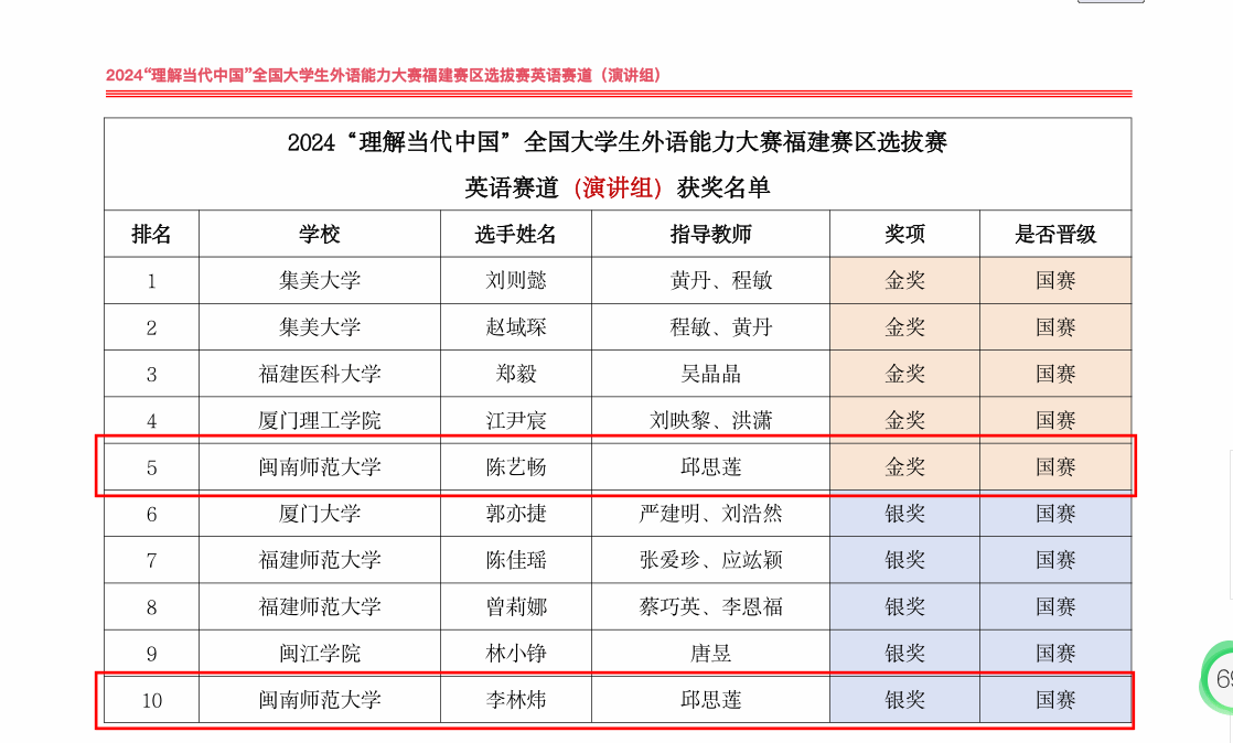 近日,由福建省教育厅主办,福建师范大学和福建医科大学承办,外语教学与研究出版社协办,福建省外国语文学会、福建省大学外语教学研究会作学术指导的2024年度的“理解当代中国”全国大学生外语能力大赛福建赛区英语赛道选拔赛顺利举行。本次大赛紧扣“理解中国,沟通世界”的主题,共设国际传播综合能力、笔译、演讲、口译及短视频等赛项,吸引了福建省内高校的众多杰出学子踊跃参与。我院学子表现优异,张曦月和陈艺畅同学分别获得国际传播综合能力赛项金奖和银奖,陈艺畅和李林炜分别获得演讲赛项金奖和银奖,以上同学均已晋级国际传播综合能力国赛。此外,陈艺畅和孙虹分获笔译赛项银奖和铜奖,林义丰和陈嘉瑶均获得口译赛项铜奖。