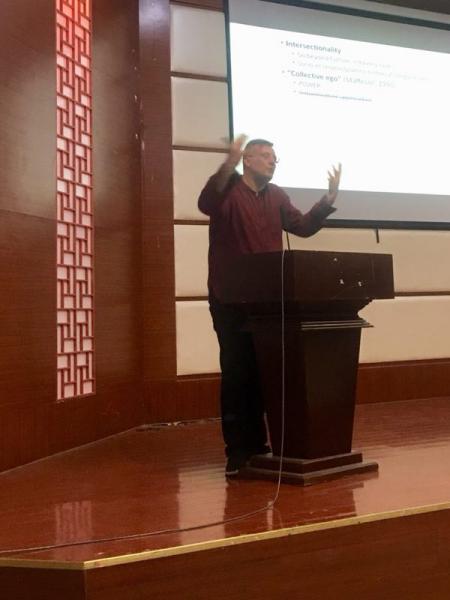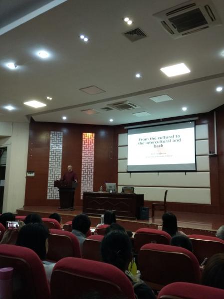 Dervin教授在讲座中讨论了“文化”一词的来源及人们对它的误解问题,强调人们应该树立对文化的正确理解与认识;接着Dervin教授以生动的实例和幽默风趣的语言讨论了文化冲突、文化禁忌、文化中心主义和全球化背景下的语言文化教育等问题,指出在文化交流中不能搞文化霸权主义,以文化为借口(excuse/alibi)强行推销某国文化;文化无优劣之分,各个国家、各个民族的人民应该本着相互尊重、平等互利的原则,求同存异,和谐共存。当代社会跨文化交际中的通行证(passport)应该是“全球化”,而不是文化中心主义或权利的游戏(power relations),以大欺小,以强凌弱。Dervin教授还从跨文化的角度谈到了语言的教育问题,指出在语言教育中应该渗透跨文化意识,使学生在语言学习中树立全球共存共荣的观念,增强学生的跨文化交际能力。