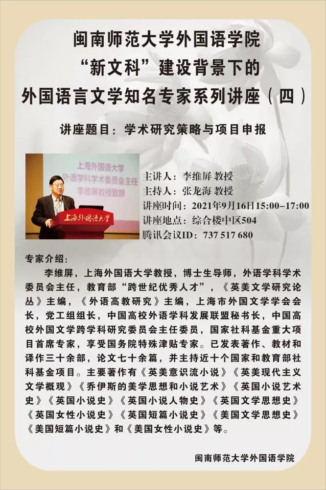 yl88858永利官网积极响应国家建设 “新文科” 的精神,针对学院学科现状及发展需求,经多方论证与研讨,特推出“新文科” 建设背景下的外国语言文学知名专家系列讲座”。yl88858永利官网将会邀请学界知名专家就 “新文科建设” 相关议题开展学术讲座,力争通过 “专家指导、思路调整、业务强化” 的立体互动模式,加快yl88858永利官网 “新文科建设” 的步伐。