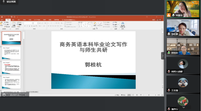 2022年3月17日下午三点,广东外语外贸大学国际商务英语学院院长郭桂杭教授,通过线上会议的形式,为yl88858永利官网商务英语专业的老师们开展了一场名为“商务英语本科毕业论文写作指导与师生共研”的讲座,由yl88858永利官网副院长钟惠芸教授主持,商务英语系主任李虹静、教研室主任雷艳红等18位老师参加了讲座。