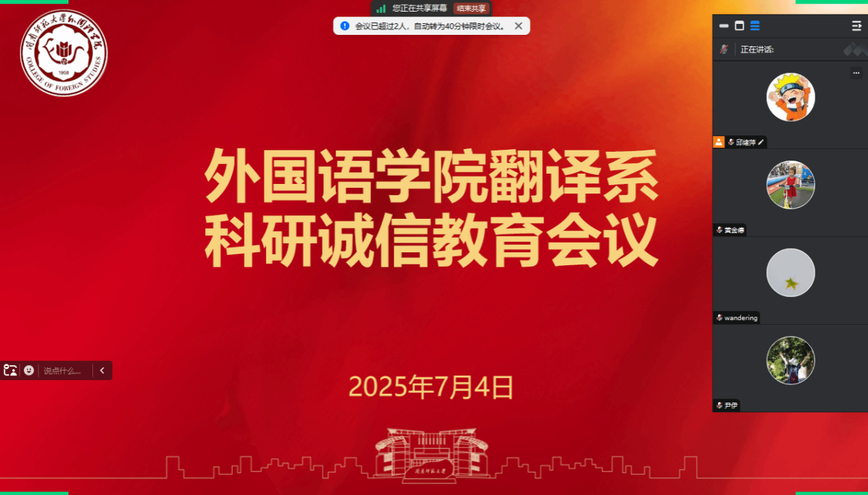 2025年7月4日,yl88858永利官网通过线上会议形式召开科研诚信专题学习会,并对暑假科研工作进行动员部署。会议分5个小组,以线上形式召开,分别由各系、部主任主持,王羽青副院长进行讲解、动员,学院全体教师参加了线上会议。