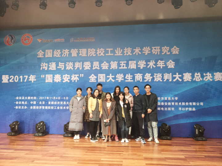 11月4日至5日,全国经济管理院校工业技术学研究会沟通与谈判委员会第五届学术年会暨2017年“国泰安杯”全国大学生商务谈判大赛总决赛在北京举行。商务英语专业钟惠芸、司延安老师带领来自商务谈判协会的八名学生,组成两支队伍参加了此次比赛。经过激烈的角逐,两支队伍双双挺进决赛,并取得三等奖的佳绩。