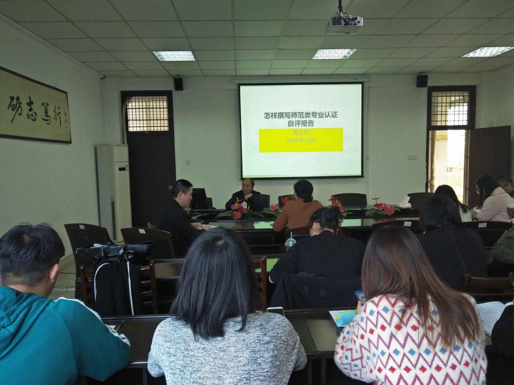 2019年12月23日下午,我校数统学院周仕荣教授应邀来我院举行讲座,为我院老师解读师范生认证的关键问题,并对我院英语(师范)专业参加师范生专业二级认证问诊把脉。吴玉玲院长、陈慧燕副书记、肖仕琼副院长、教务科副科长罗鹏兴、专业负责人、部分专任教师、全体政工干部参加了讲座。