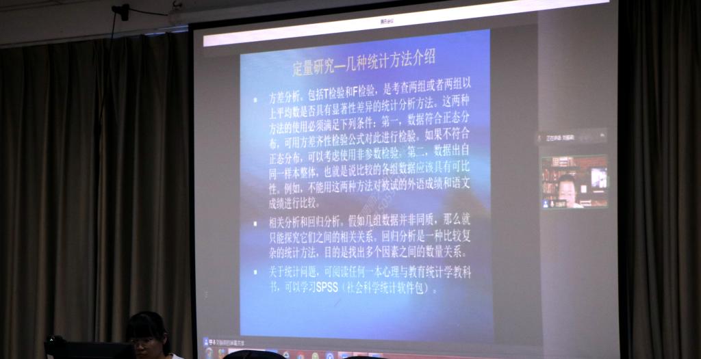 刘振前教授首先讲解了课题选择问题,聚焦外语教学研究的两种方法:定性研究与定量研究,分析了两种研究方式的特点和操作方式,指出:两者之间没有优劣之分,可根据课题的不同性质采用不同的研究方案。他同时强调,如果要掌握某种研究方法或理论,需要追溯其起源及发展脉络。