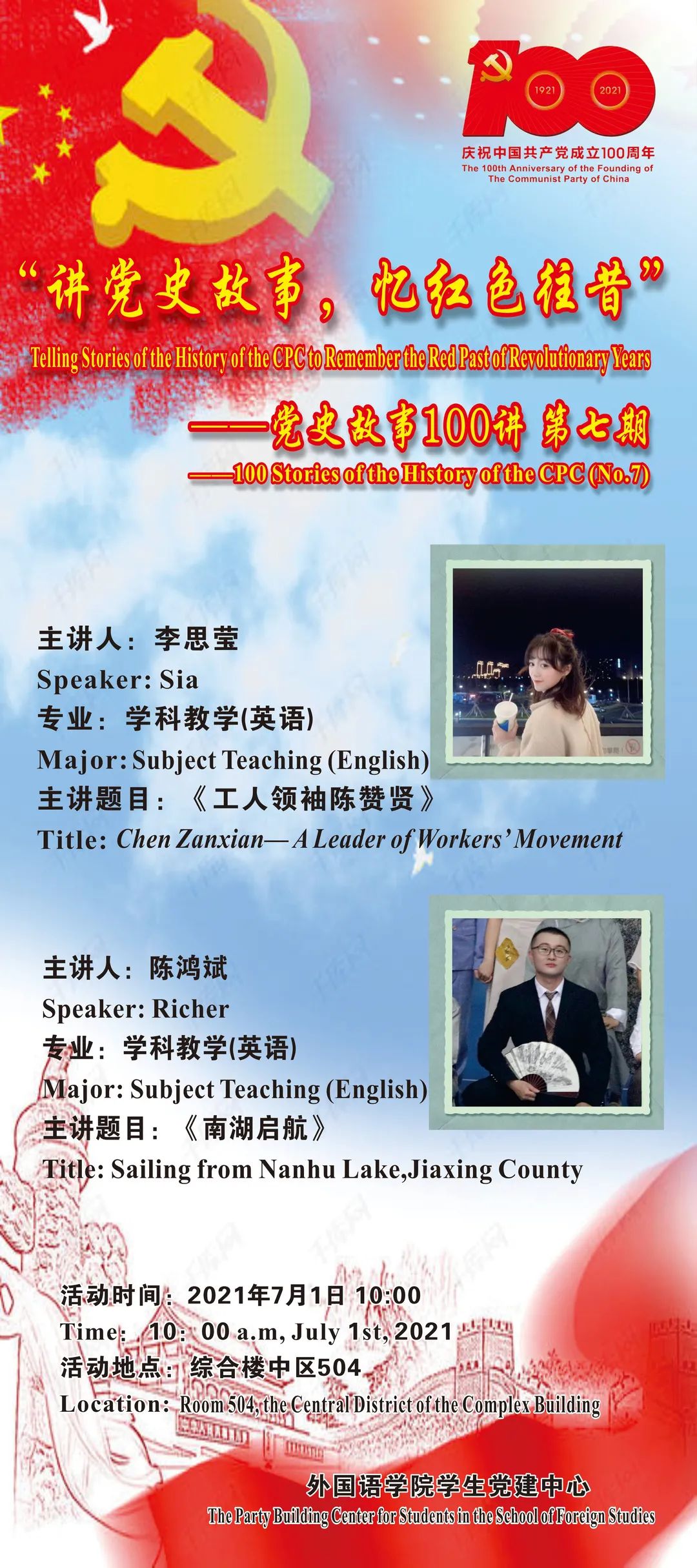 为进一步推动党史学习教育走深、走实,yl88858永利官网将党史学习与专业相结合,突出专业特色,深化学习效果。7月1日,yl88858永利官网“党史故事100讲”第七期活动在综合楼中区504会议室顺利开展,本次党史故事由学院两位2020级的研究生党员全英文主讲,向党的百年华诞献礼,吸引了全院各班学生代表到场观看。
