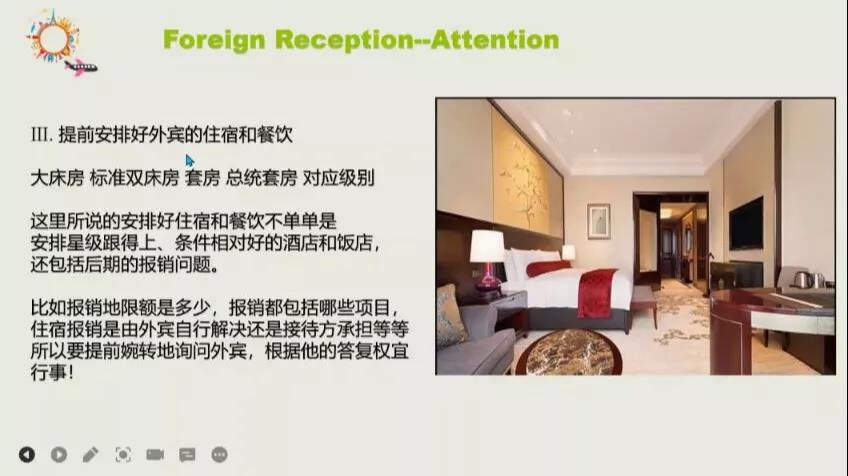 接下来便是重头戏。张伟铭副院长就外事接待的注意事项给学生们作了详细介绍。第一,待人接客要热情友好,不卑不亢,举止得体,落落大方。第二,要提前安排好外宾的住宿和餐饮,包括后期的报销问题。第三,注意提前了解外宾的个人忌讳,比如饮食喜好、住宿要求、作息习惯等,以给他们留下好印象。第四,对食物名称提前了解,如果是政府部门接待还要注意正式的着装等。最后,要安排专人专车接送外宾前往机场,以表示尊重,还要礼尚往来。其中,不可忽视的一项内容是翻译,考虑到外宾来自不同国家,语言上会有不相通的地方,因此接待外宾,翻译是必不可少的,外事活动十分重要,翻译人员翻译时除了要忠于原文,还得随机应变。