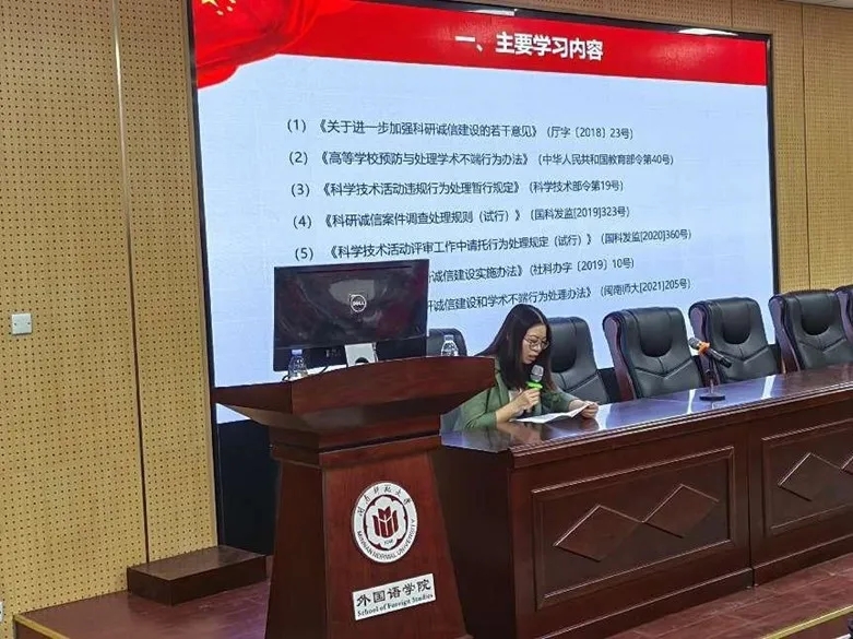 本次学习活动的主要内容包括教育部出台的《高等学校预防与处理学术不端行为办法》和我校出台的《闽南师范大学科研诚信建设和学术不端行为处理办法》等七个文件。钟惠芸副院长首先带领全院专任教师回顾了党中央重视科研作风学风建设的会议,并解读了党的二十大精神对科研工作者的新要求和新挑战。