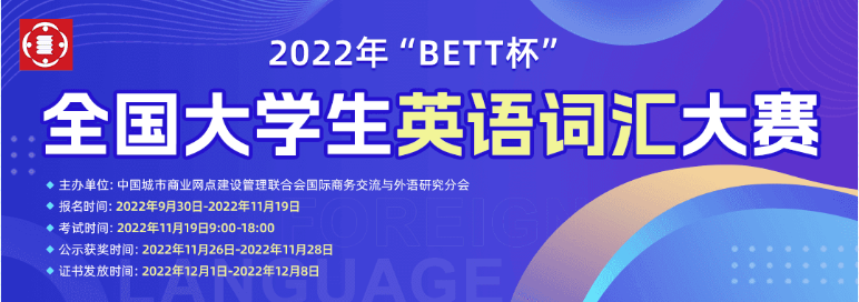 为贯彻落实教育部《关于加快建设高水平本科教育全面提高人才培养能力的意见》等文件精神,激发大学生学习外语的兴趣,服务国家战略发展,担当铸魂育人使命,中国城市商业网点建设管理联合会国际商务交流与外语研究分会特举办2022年“BETT杯”全国大学生英语词汇大赛(从2022年“BETT 杯”全国外语语言应用大赛分离的分项赛)。