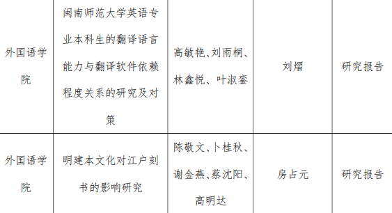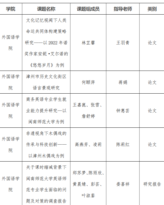 引导全院学生深入学习党的二十大精神,贯彻落实好习近平总书记关于党的青年工作重要战略导向,主动发挥共青团在学院学生思想政治、科学素养培育工作中的主力军作用,我院团委积极引导学生参加闽南师范大学2022年大学生科技文化节,在全体参赛学生的不懈努力下,在相关老师的细心指导下,我院学生林芷馨、何颐萍、王嘉崑、张雪、詹舒婷、高燕芳、凌莉、郑苏梦、陈雨欣、黄晨婧、彭芸、叶淑銮、高敏艳、刘雨桐、林鑫悦、陈敬文、卜桂秋、谢金燕、蔡沈阳、高明达所负责的课题经校团委审核评估后圆满结项。