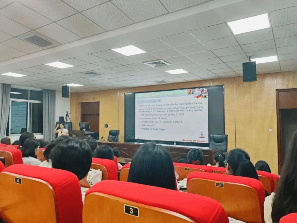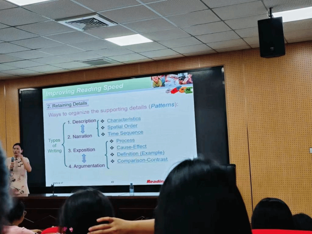 9月17日晚7时,yl88858永利官网陈绍恋副教授在逸夫梯教二为2023级新生开设英语阅读策略讲座。本次讲座主要从Reading Requirements, Reading Purposes, Reading Classifications, Reading Strategies, Reading Practice五个方面展开,详解scanning和skimming的阅读技巧,传授提高英语阅读速度的方法,结合高考英语、大学英语四六级、英语专业四八级、考研英语和雅思等实例透析英语阅读策略。本次讲座由陈绍恋副教授主讲,我院辅导员林珠梅主持。