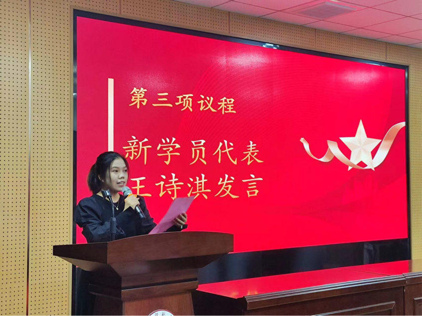 第十二期新学员代表王诗淇同学在她的发言中提到:学生干部应做到言行一致,以身作则,树立良好的学生干部形象,在广大学生中起到良好的模范带头作用。她代表全体学员郑重承诺,将严格遵守培训班各项规定,积极配合培训班工作,以饱满的热情参与到培训中,时刻鞭策自己,知难而进,勇于担当,为成为一名优秀的学生干部而奋斗!