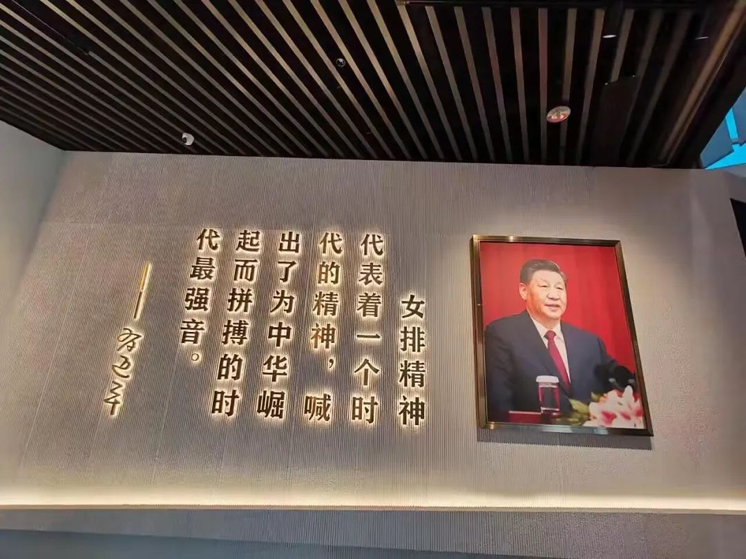 走进展馆,首先映入眼帘的是习近平总书记强调的“女排精神”。 2019年,习近平总书记在会见中国女排代表时指出:“中国女排在赛场上展现了祖国至上、团结协作、顽强拼搏、永不言败的精神面貌”,“女排精神代表着一个时代的精神,喊出了为中华崛起而拼搏的时代最强音”。2021年,女排精神被纳入中国共产党人精神谱系。