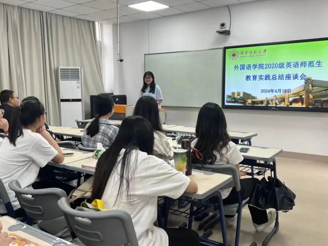 实习促成长,实践精业务。为落实师范生教育实践各项工作要求,加深师范生对基础教育现状和英语学科教育理论的理解,同时为毕业后尽快适应教育教学工作奠定良好基础,我院于4月18日下午在综合楼北区505举行2020级英语师范生教育实践总结会。参加本次总结会的有学院英语系主任陈彩虹老师、英语教育教研室主任李祯老师、辅导员陈雅鹏老师及部分2020级英语师范生。会议由李祯老师主持。