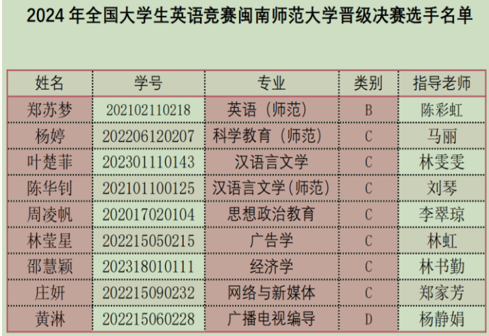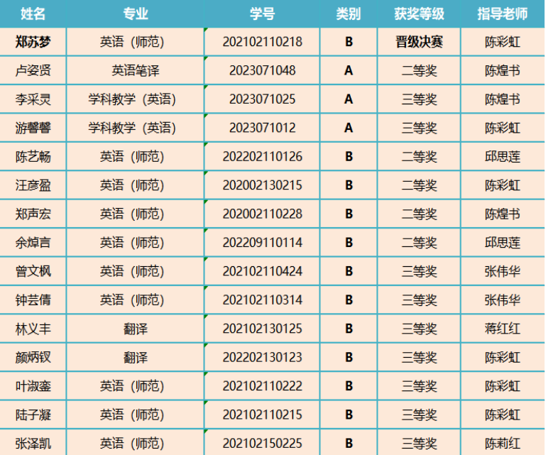 2024年全国大学生英语竞赛决赛将于全国统一时间2024年5月19日9:00--11:00在各省级赛区举行。预祝晋级决赛的选手取得优异的成绩!闽南师范大学2024年全国大学生英语竞赛A类和B类获奖名单如下: