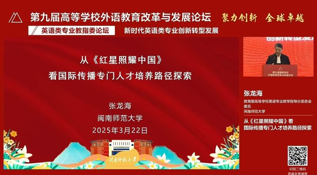 张龙海在论坛做了题为“从《红星照耀中国》看国际传播专门人才培养路径探索”的主旨发言。随后,在特别策划的《外语教育专家视野》系列访谈中,他以《红星照耀中国》的国际传播范式为切入点,围绕“‘四新’背景下外语学科育人路径创新”展开论述,分析了当前国际传播中“有理说不出,说了传不开”的困局。他指出,突破这一困局的关键在于构建“三位一体”人才培养体系:在语言根基维度,着力夯实学生“有话能说”的语言能力、“有话可说”的知识储备和“有话会说”的话术素养;在实践能力层面,注重培养学生的跨文化交际意识和“有话好说”的沟通智慧;在价值塑造领域,积极践行五育融合理念,筑牢“有话敢说”的底气担当。通过这种体系培养出的人才,将有力推动国家话语体系的建构,为中国式现代化进程注入新的活力。