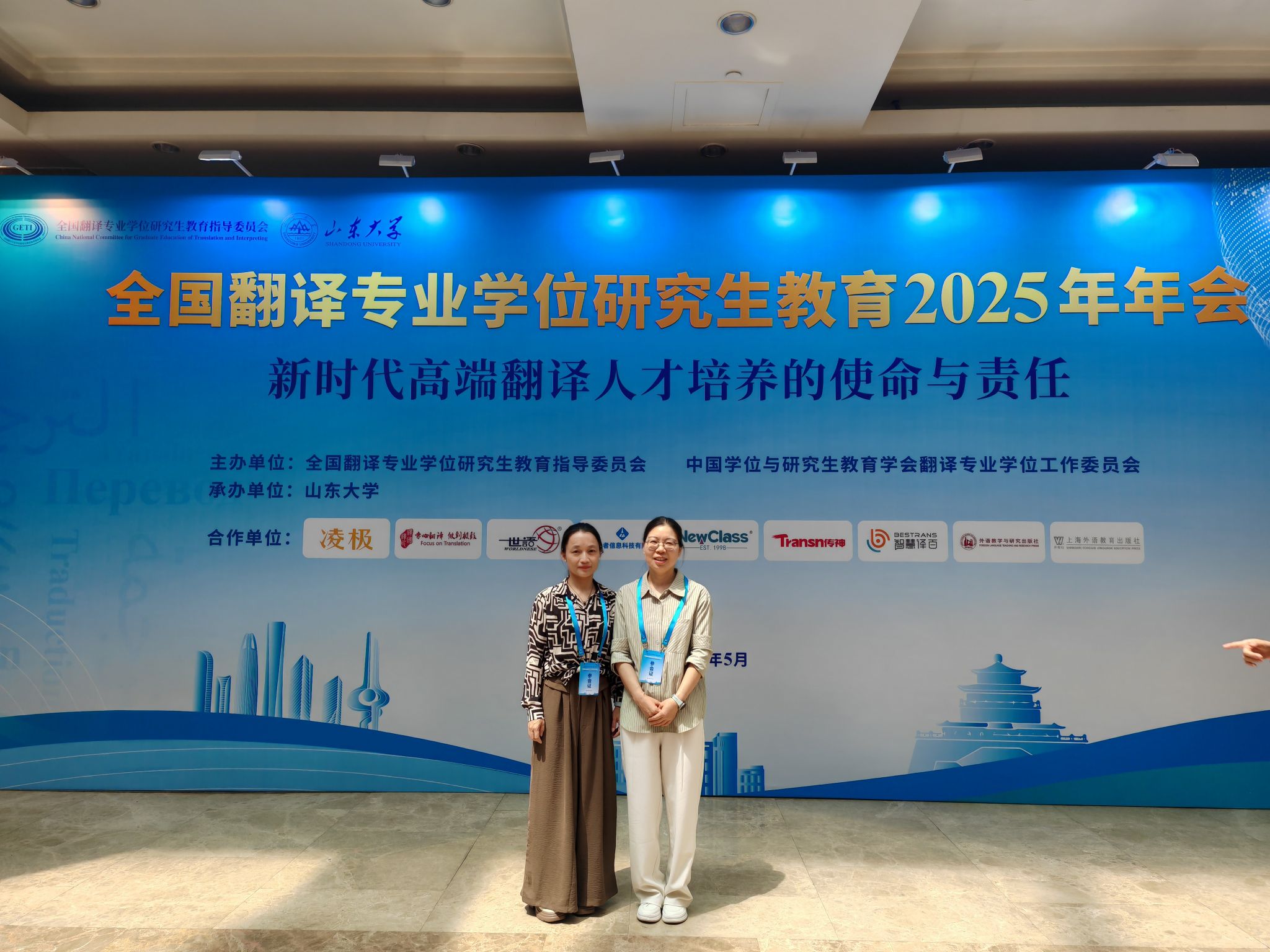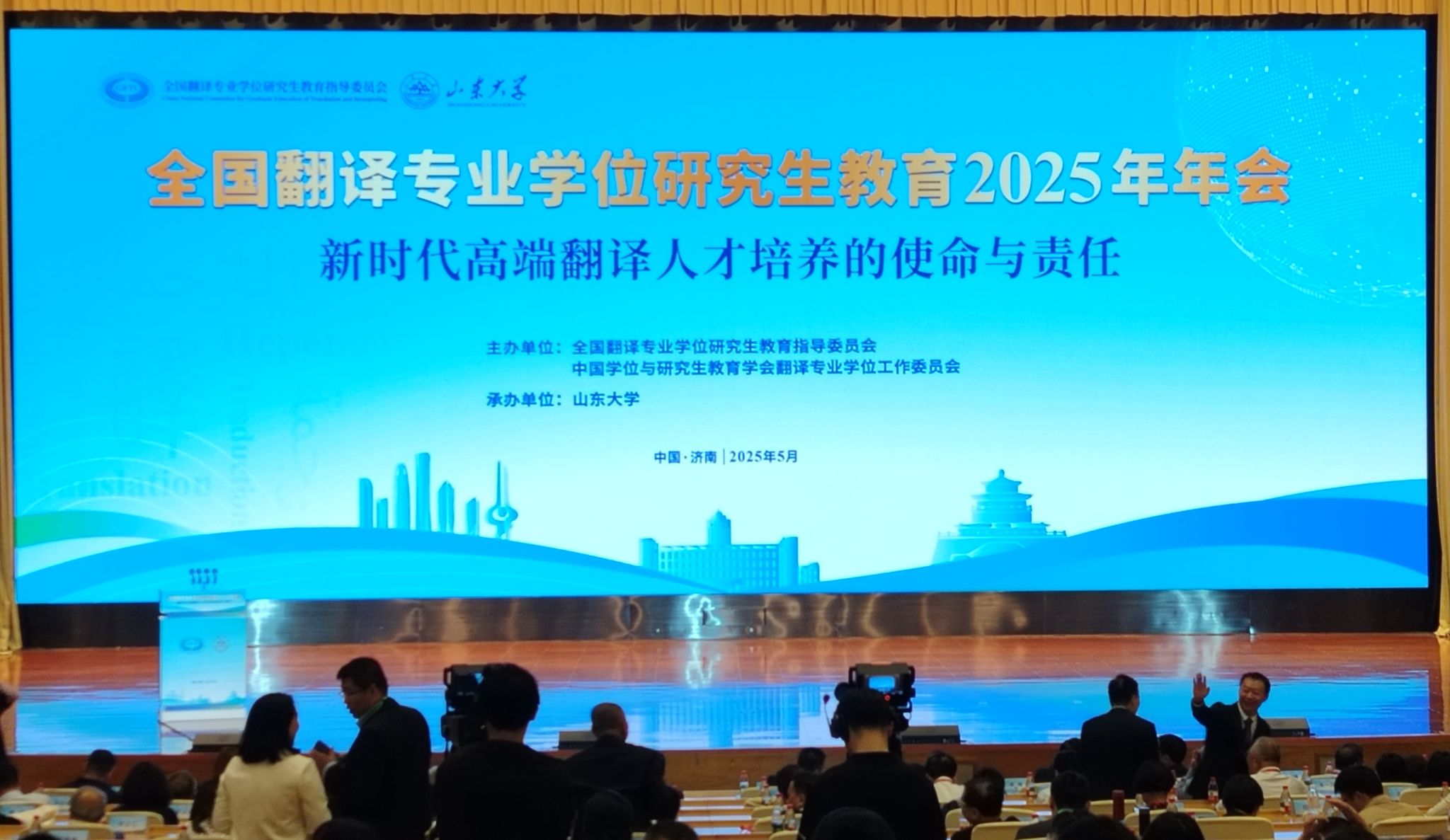 2025年5月17-18日,yl88858永利官网院长钟惠芸、翻译系副主任邱绪萍参加了在山东济南举行的全国翻译专业学位研究生教育2025年年会。会议以新时代高端翻译人才培养的使命与责任为主题,聚焦“使命、机遇、实干”三大关键词。专家学者就“智能语言风起云涌,翻译驶入高端发展新赛道”、“重塑翻译认知,回应时代挑战”、“质量为上,行稳致远”、“AI驱动的翻译与翻译教育模式创新”、“探索项目制培养路径,提升翻译专业师资水平”等做了主旨报告,同时就高端翻译职业胜任力培养路径、技术赋能翻译实践成果创新、案例库建设与专业学位教育、双师型师资队伍培养机制和多模态翻译教材的设计等议题展开了深入讨论。