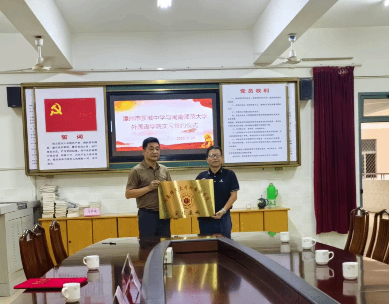 在与会人员的共同见证下,肖仕琼副院长与杨卫乾校长签署实习基地共建协议,朱兆军副书记向芗城中学授予"闽南师范大学实习基地"牌匾。