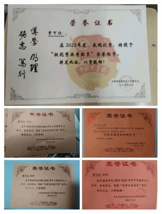 1.2024年5月获评校级优秀共青团员称号;