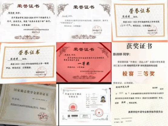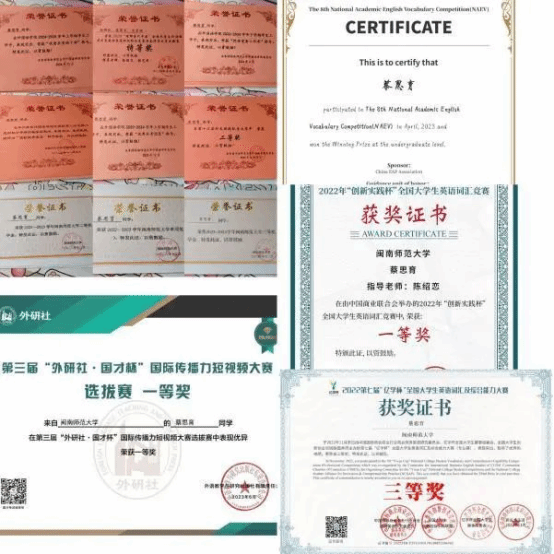 1.2022年11月获2022第七届“亿学杯”全国大学生英语词汇及综合能力大赛省三等奖;