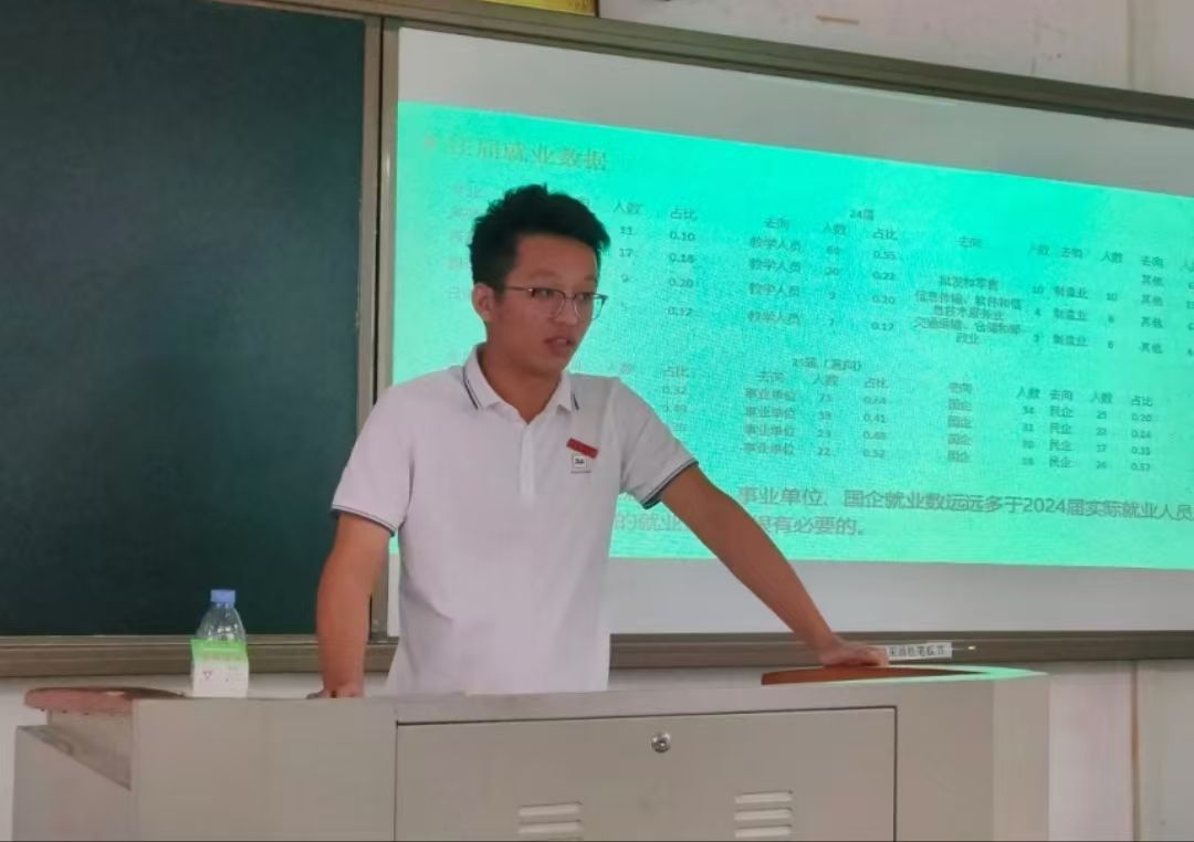 随后,辅导员黄佳贤通过就业数据分析、就业政策宣讲增强毕业生就业意识,通过分享就业信息收集方法、就业前准备材料、就业防诈骗攻略等对毕业生就业进行详细地指导。
