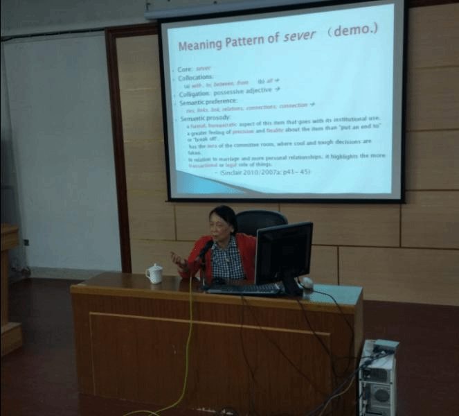 下午3点,在逸夫楼梯教二,何教授作了题为“语料库语言学与英语科研”的讲座,介绍了语料库语言学的核心概念,阐述了语料的词汇共选、意义单位、多形态短语、关键词等概念,讲解中辅以实例操作,理论与实践相结合,深入浅出,获得了与会听众的一致好评。