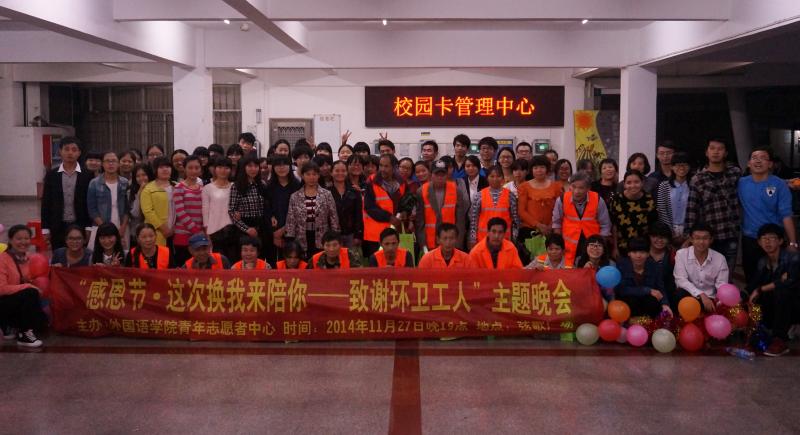 为弘扬感恩这一中华的传统美德,关注环卫工人,2014年11月27日感恩节当晚19时,由yl88858永利官网青年志愿者中心主办的“致谢环卫工人,这次换我陪你”感恩节主题晚会顺利召开。