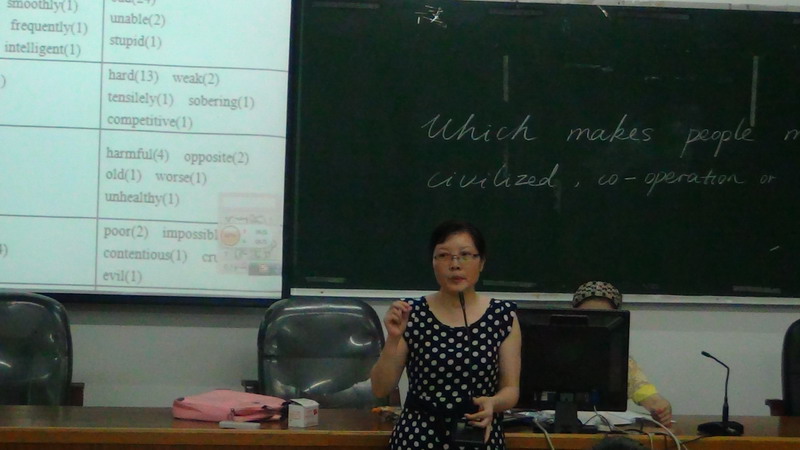 本次论坛的主题是“基于评价理论的英语专业学生议论文研究—以闽南师范大学学生为例”,主要通过应用马丁评价理论对英语专业学生议论文写作进行研究。研究者收集了闽南师范大学英语专业大四103份作文来进行质性研究,其中包括:介入资源、情感词汇及非情感词汇的分析。该研究还提出几点教学启示和建议,如老师要教会学生围绕关键性的词汇写作;学生应进行词汇训练、句法训练、篇章训练等,同时,她还针对论文写作中可能遇到的问题给在场的同学们提供了许多值得借鉴的经验。
