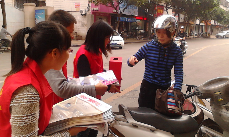 5月4日上午,外语系青年志愿者中心与小桔灯英语培训机构联合举行了以“爱心义卖报纸·为雅安加油”为主题的志愿活动。来自外语系青年志愿者中心35名同学参与其中。