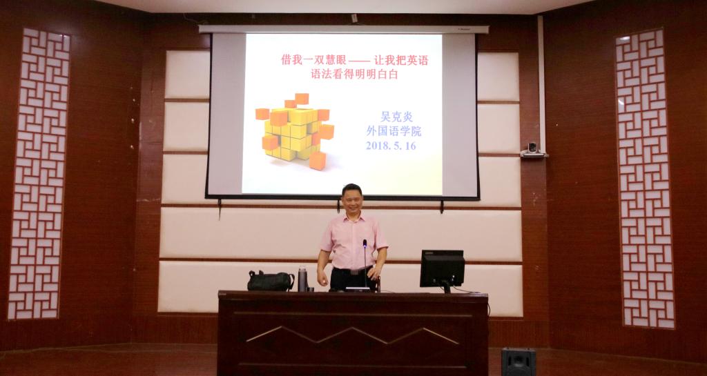 516日晚7点半,我院吴克炎教授以“借我一双慧眼,让我把英语语法看得明明白白”为题在东区报告厅开展讲座。我院部分本科生和研究生前来聆听。