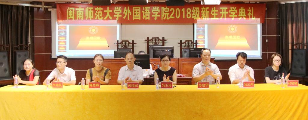 典礼在慷慨激昂的国歌中拉开帷幕。首先吴玉玲院长致辞,向2018级新生表示衷心的欢迎,并向新生介绍了学院基本情况和发展方向。吴院长讲了两个小故事, 18级新生们踊跃积极举手参与互动,通过简单的小故事激励新生们:一切都是最好的安排,要始终充满自信!吴院长对新生提出了殷切的希望,希望同学们可以自我勉励、自我鞭策。珍惜在闽南师大宝贵的学习机会,严于律己、诚信做人、不负众望、早日成才。