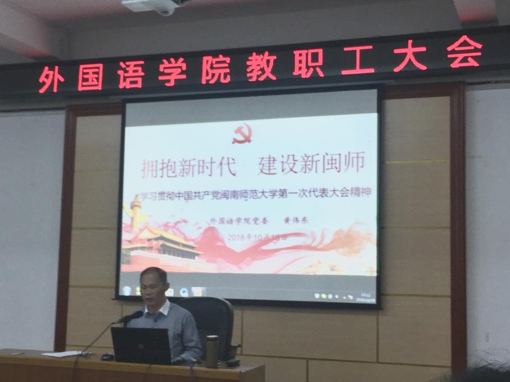 10月18日下午,我院在逸夫楼梯教二召开教职工大会,会议传达中共闽南师范大学第一次党代会精神。学院党委书记黄伟东同志主持会议,全院教职工参加会议。