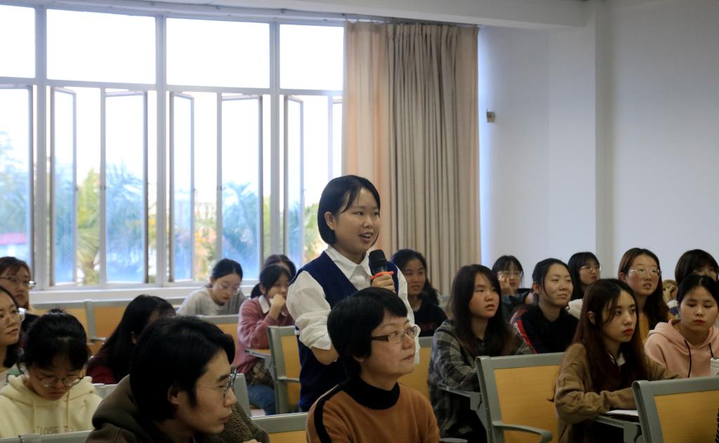 在提问环节,针对同学们提出的“宫泽贤治的人生转折原因”、“日语学习中可能遇到的弯路”等问题,周教授通过详细列举例子为同学们答疑解惑并勉励大家,作为日语专业的学生,要提高语言实践能力,以独特创新的视角了解其特色的文化背景。