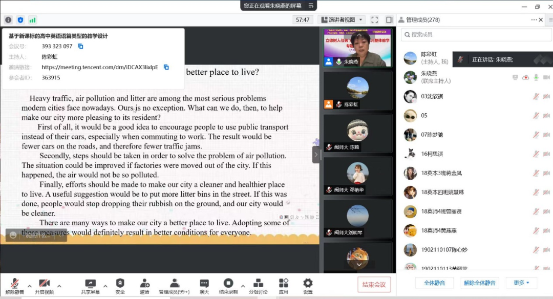 2022年5月5日晚上7时30分,“落实新课标理念、加强语篇类型教学设计”主题讲座以腾讯会议形式召开。参与此次讲座的有yl88858永利官网英语系全体老师、18级和19级英语师范生以及20、21级英语教育硕士研究生。华南师范大学朱晓燕教授做主题讲座,我院英语系系主任、专业负责人陈彩虹博士主持本次会议。