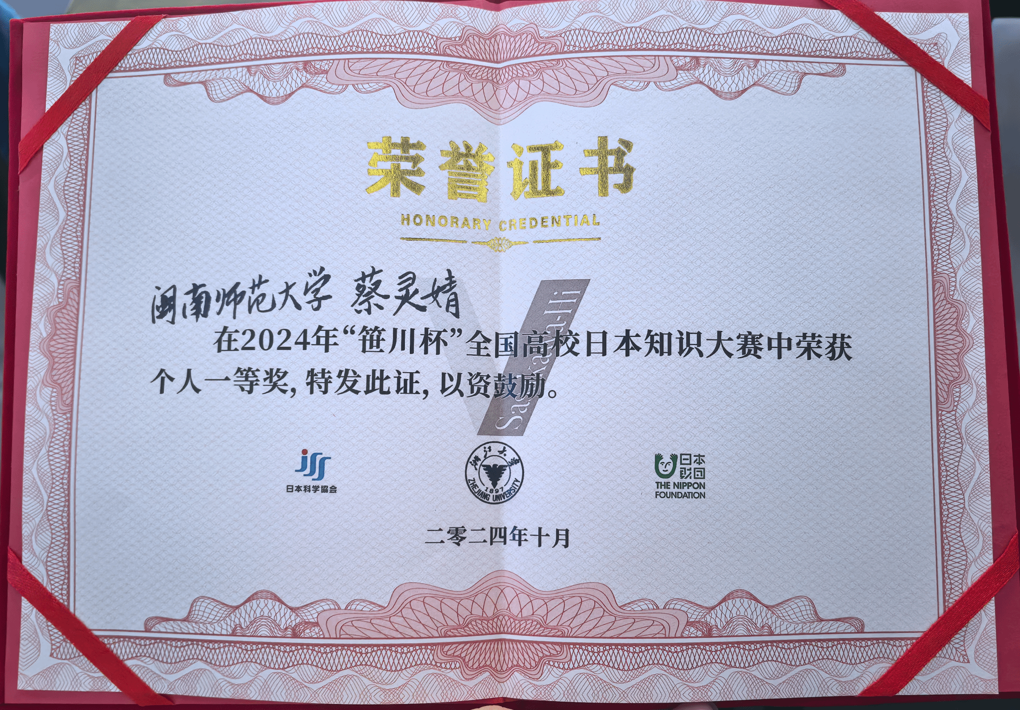 近日,由日本科学协会和浙江大学共同主办的“2024年笹川杯全国高校日本知识大赛”顺利举行。我院蔡灵婧同学荣获“个人奖一等奖”,团队荣获“团体优秀奖”,陈娴老师荣获“杰出指导教师奖”。