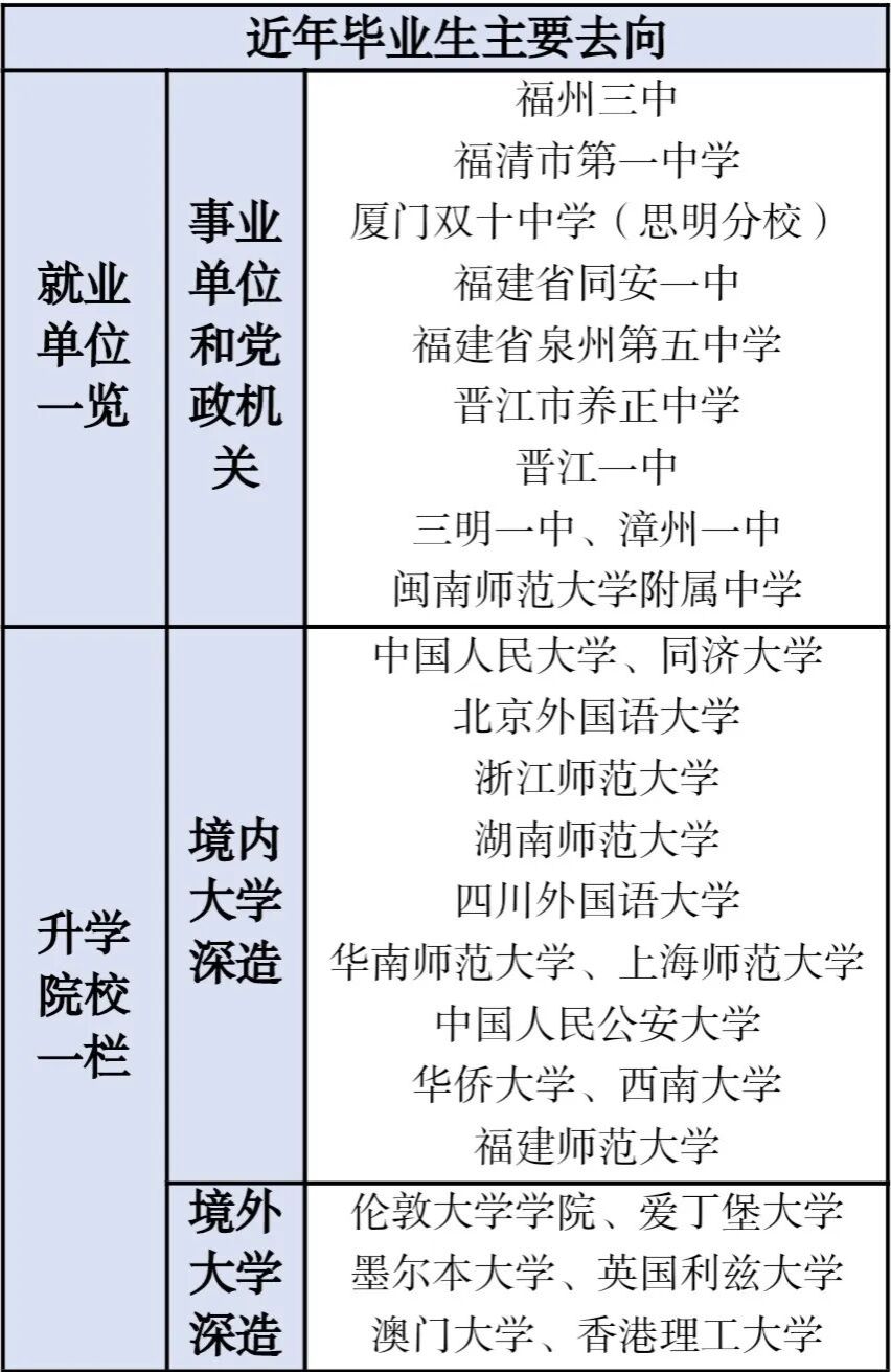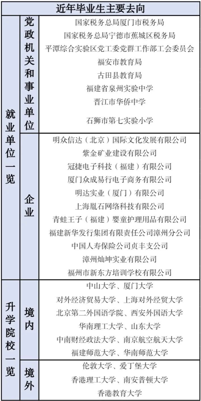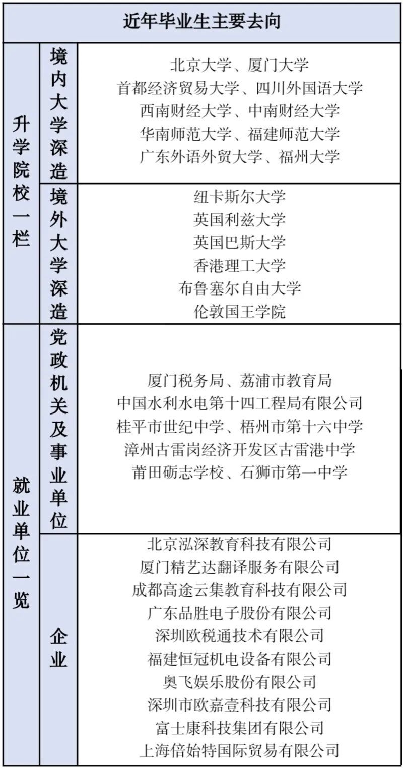 本专业聚焦培养 “英语功底扎实、教学技能精湛、教育理念创新” 的高素质师范人才,毕业生主要面向基础教育领域,从事中学英语教学、教研及管理工作,或报考国内外高校相关专业继续深造。就业前景良好,受到用人单位好评,有多名毕业生成为名师、名校长。