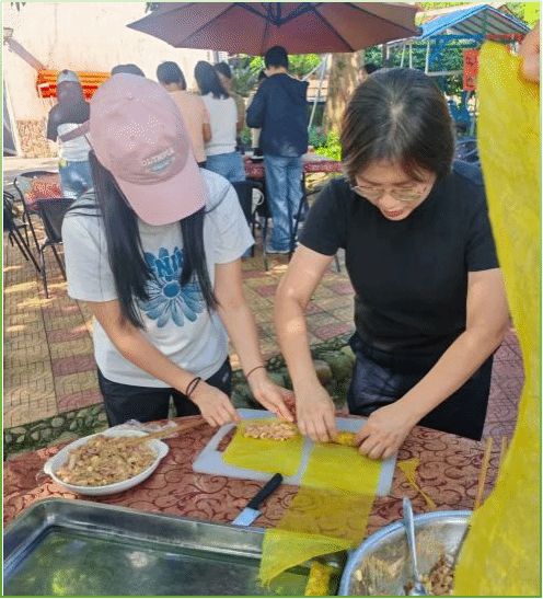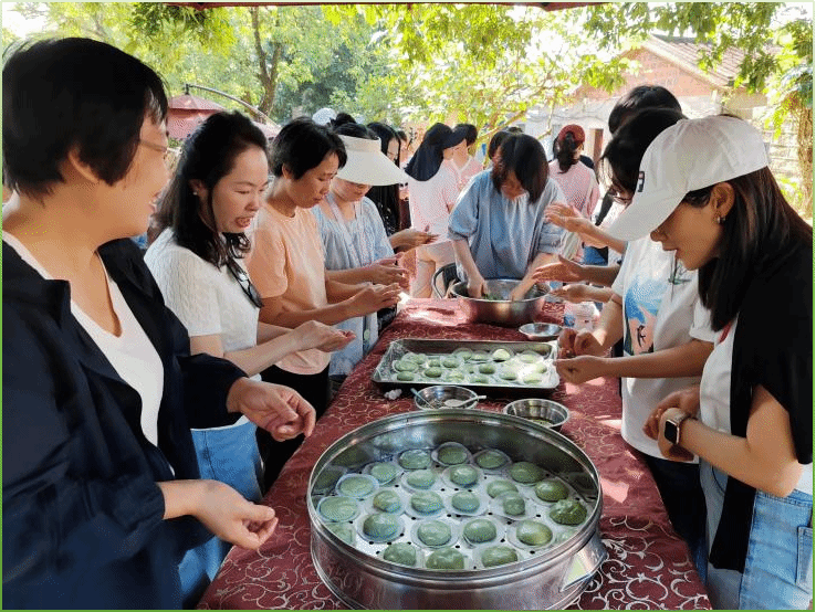 在团队协作环节中,教职工们分组参与包五香、做艾草粿等美食DIY活动,和面、调馅、塑形,大家分工协作、默契配合,制作完成的特色美食让大家收获了满满的成就感。