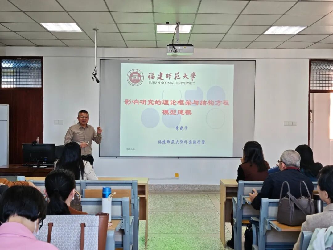 2025 年 12 月 16 日下午,yl88858永利官网“师者云”系列学术讲座在综合楼中区504顺利举办。学院特邀福建师范大学yl88858永利官网李光泽副教授,围绕“影响研究的理论框架与结构方程模型建模”展开专题分享,语言学与翻译学方向的教师聆听了本场讲座。